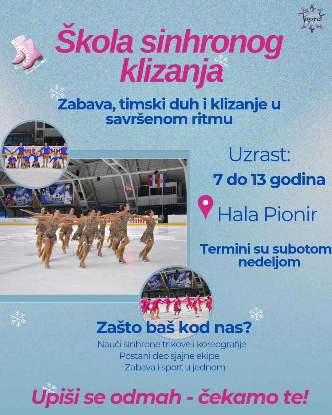 Pozivamo sve zainteresovane devojčice i dečake bilo kog uzrasta kao i starije ljubitelje klizanja da nam se pridruže u školi sinhronog klizanja.